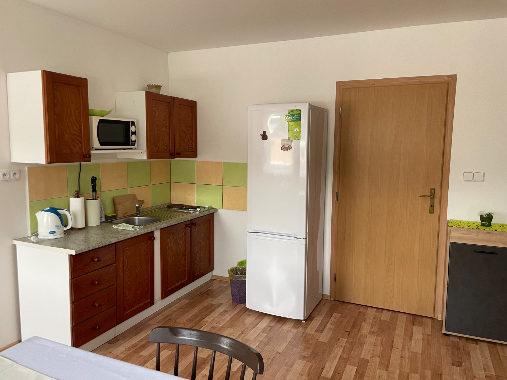 Samozřejmostí je kuchyňský koutek s elektrickým dvouvařičem, mikrovlnnou troubou, rychlovarnou konvicí, ledničkou s mrazákem a jídelním posezením.